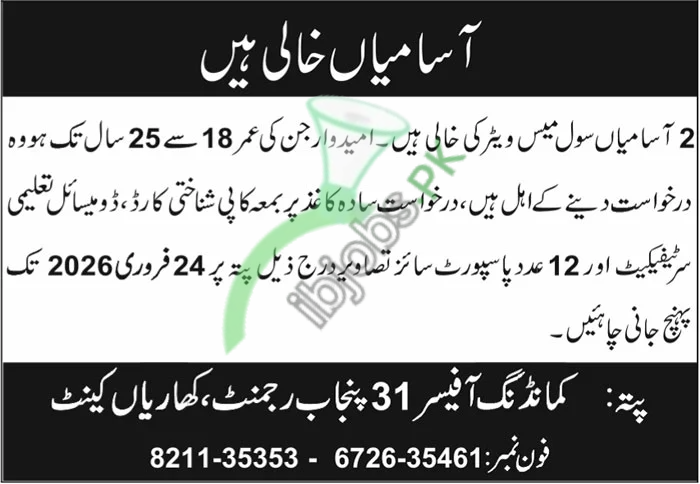 Tap to this page and have Pak Army 31 Punjab Regiment Kharian Cantt Jobs 2026 Latest. Latest jobs for civilian staff possessing domicile of Punjab, Kharian against the following positions such as (Civil Mess Waiter).